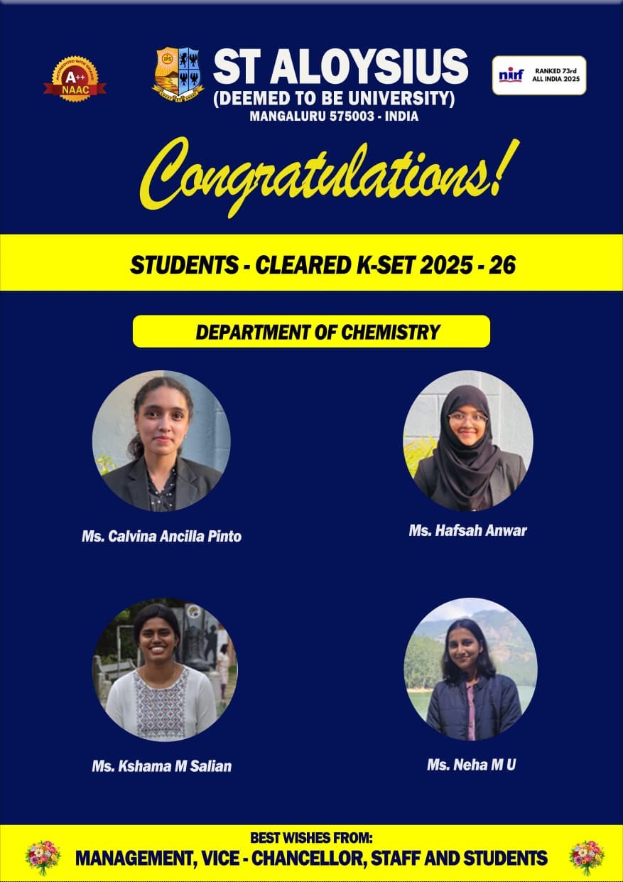The Department of Chemistry, one of the oldest and most prestigious departments of the institution, traces its origins to 1882 when it functioned under the School Department affiliated to Madras University, and later became an independent department in 1926. With a long-standing commitment to academic excellence, the department offers comprehensive undergraduate and postgraduate programs, including M.Sc. Chemistry and M.Sc. Analytical Chemistry, established in 2007 and 2012 respectively. It provides a vibrant learning environment enriched through national and international conferences, seminars by distinguished experts, workshops, industrial visits, and annual chemistry competitions for pre-university students. The department also supports students through specialized sessions for examinations such as IIT-JAM, NET, KSET, and GATE, along with six certificate courses that enhance academic and professional growth. With seven recognized research guides, the department offers a Ph.D. program covering diverse areas such as adsorption studies, catalysis, photodegradation, nanocomposites, synthetic organic chemistry, corrosion studies, and natural product isolation. Backed by a highly qualified and dedicated faculty team, the Department of Chemistry continues to foster innovation, research and holistic development among its students.